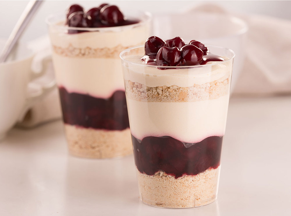 Mix the melted butter with the biscuit crumbs and press them into the bottom of the glasses. Place a layer of Strudela on the biscuit base, then the Yogurt Pie Fill, then a layer of the biscuit mixture and finish the dessert with a generous amount of Strudela.